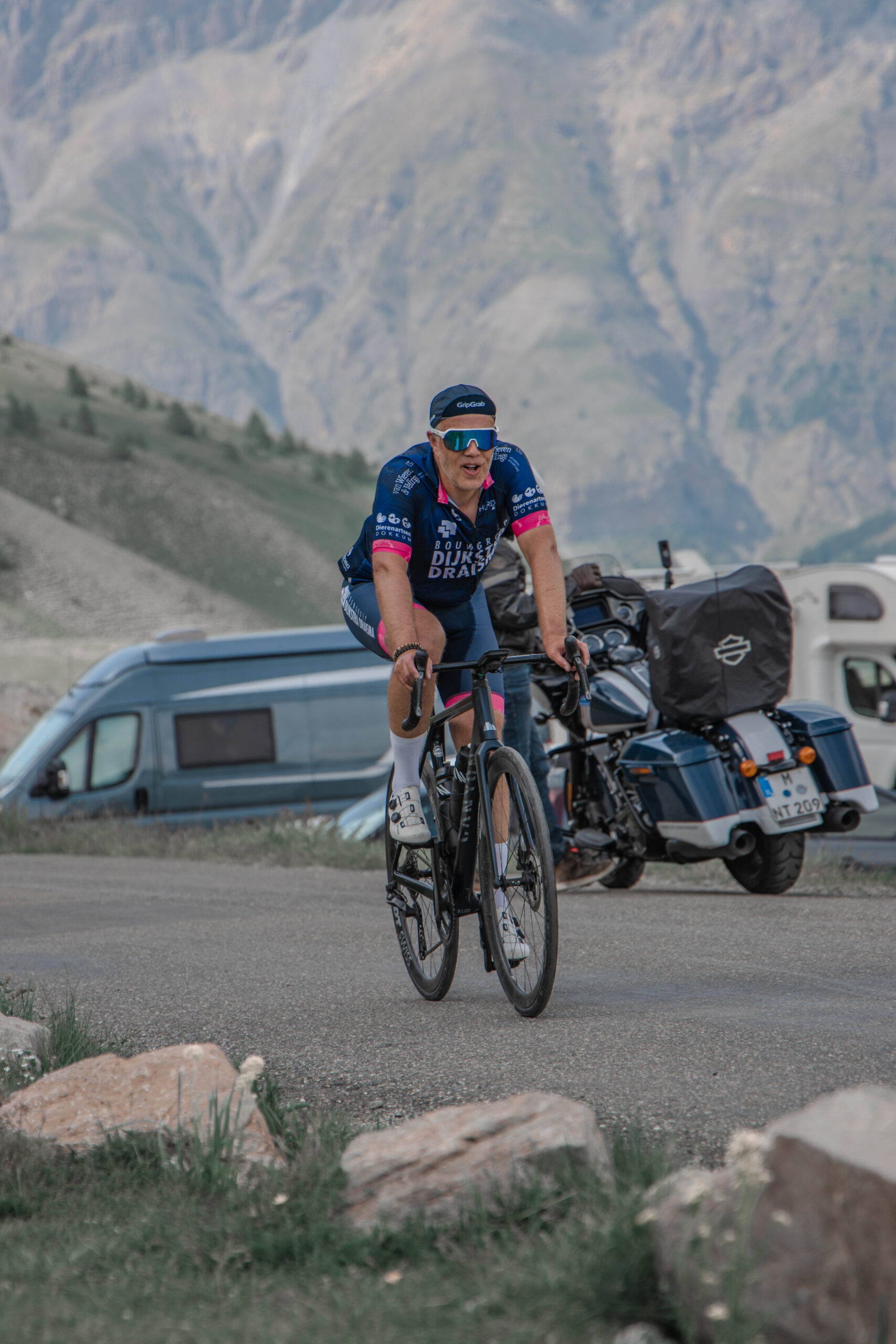 Samen met mijn vriendin fietsen wij samen bij Wielerploeg Palestra in Dokkum. We zijn in 2019 begonnen met het wielrennen bij Wielerploeg Palestra. Ik had al jaren een racefiets maar kon niet de motivatie vinden om veel en gestructureerd te trainen. Door de indoor wielrentrainingen van Bart werd ik erg gemotiveerd. Uiteindelijk hebben we samen beloten ons in te schrijven voor de clinic naar Alpe d’Huez. Tijdens de buitentrainingentrainingen voor de clinic werd ik middels intensieve en leuke oefeningen uitgedaagd om alles te geven en me te blijven verbeteren. En het werkte. Naast de trainingen zijn er ook diverse trainingen wat verder weg, Posbank en VAM berg, en toertochten waardoor er een gezellige sfeer ontstaat. Je traint met z’n allen voor een doel, dat werkt zo goed!